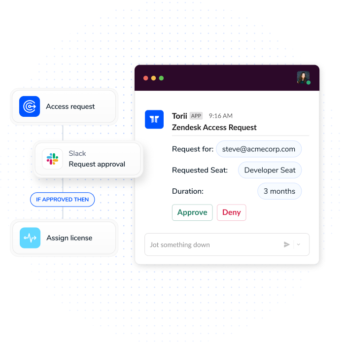 Access governance fails when approvals live outside daily workflows. Torii brings requests and approvals into the tools teams already use—without sacrificing control.