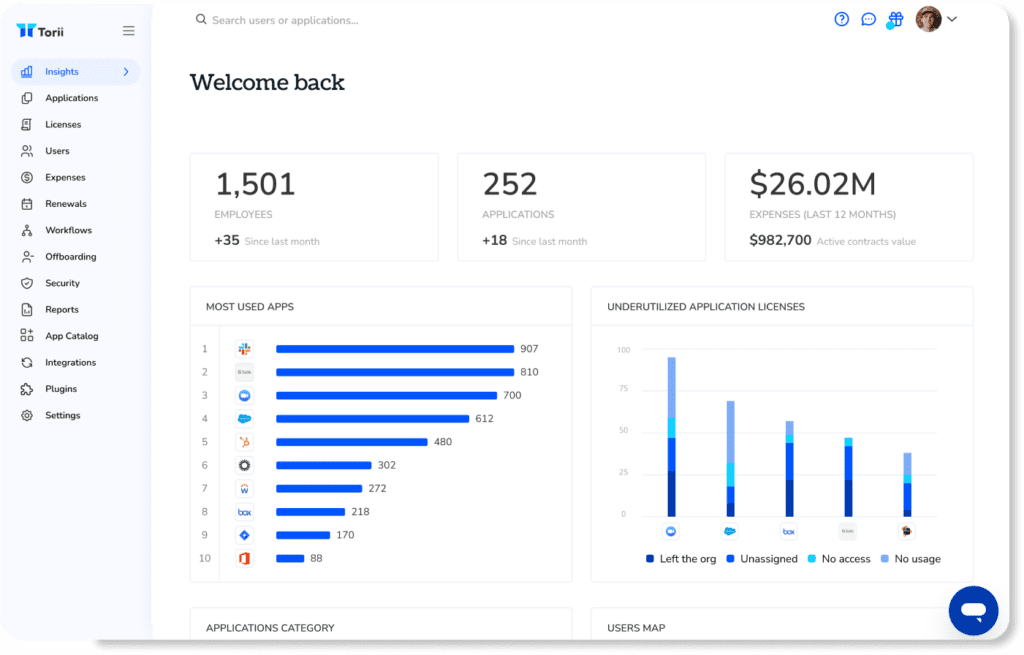 Torii connects applications to usage/adoption and spend context to highlight underused seats and tier mismatch. This helps teams see where licenses are inactive, where premium tiers aren’t justified, and where the biggest cost-impact opportunities are—without relying on one-time spreadsheets.