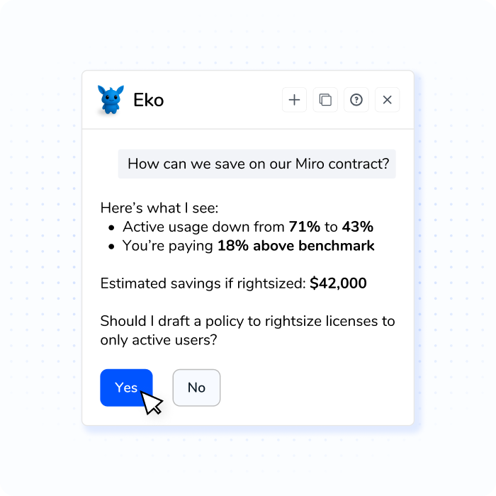 Eko, your SaaS management copilot, turns waste patterns into policies you can approve—stopping sprawl and waste before they start.