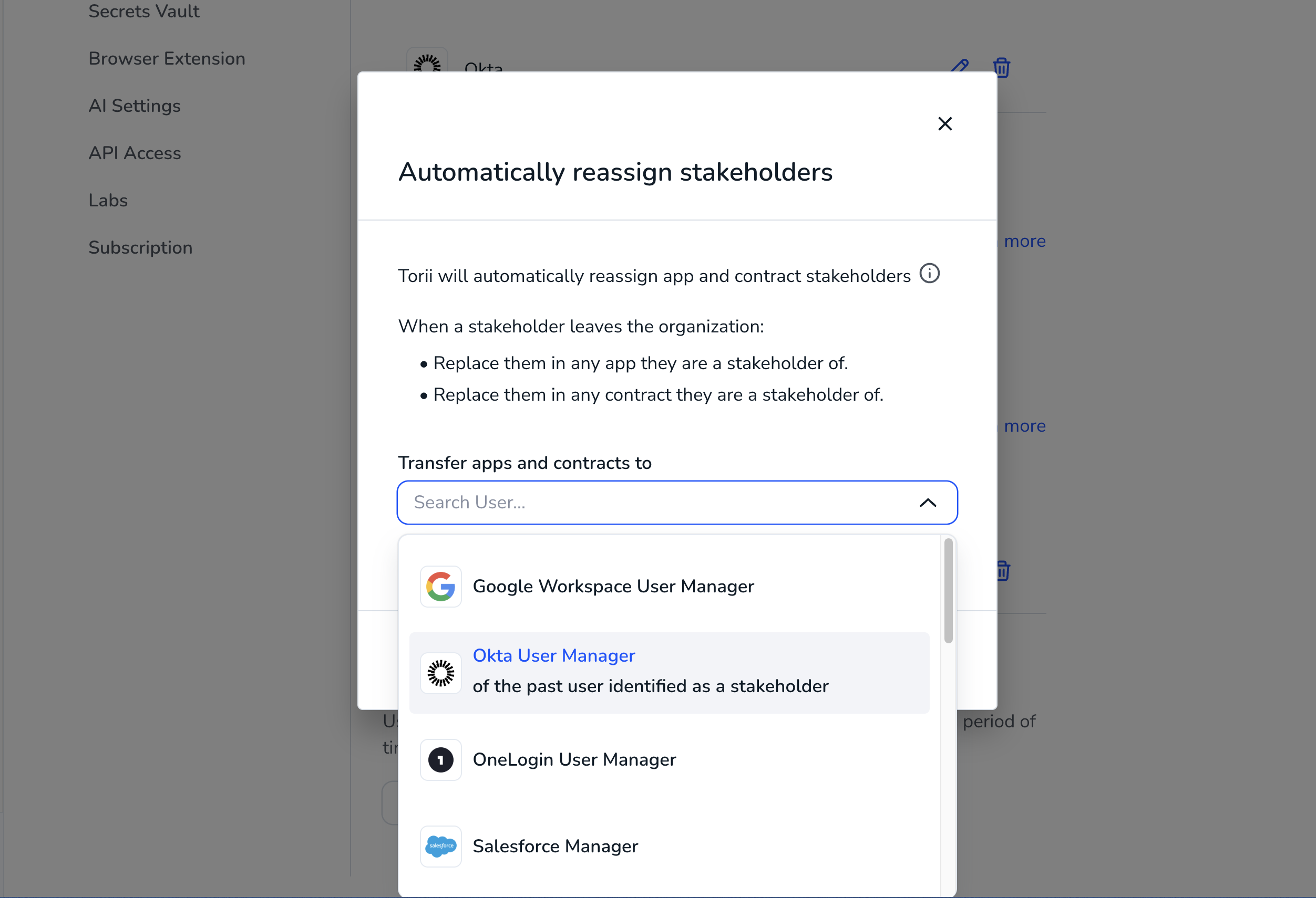 Automatic Stakeholder Replacement: Instantly reassigns app and contract stakeholders when someone leaves, so nothing falls through the cracks.